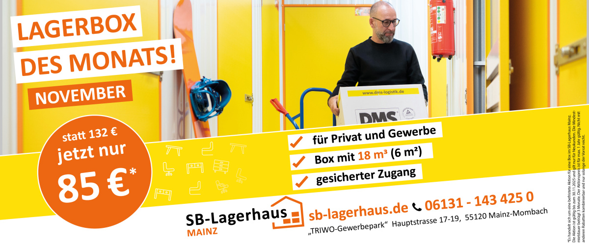Da es oftmals mit dem Umziehen allein nicht getan ist, halten wir für Sie noch viele weitere nützliche Angebote bereit. Für Umzüge mit "Zwischenstopp" bietet unser SB-Lagerhaus privaten und gewerblichen Kunden günstige, saubere und sichere Lagerboxen direkt in Mainz. Und das sogar klimaneutral.
